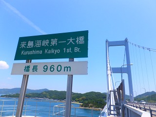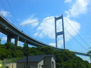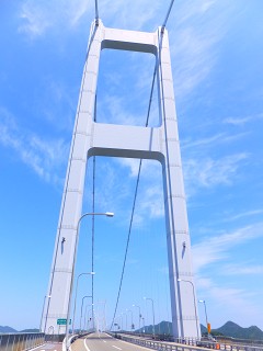 さ、帰り道帰り道。 さっきのぐるぐるの所から見上げる形で、来島海峡第一大橋を撮影。 私、実は橋を見上げる構図って好きなんです。なんだかどーんと迫力ある感じで。