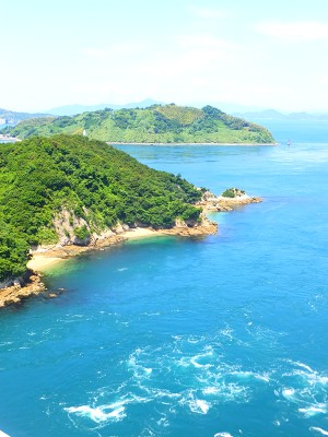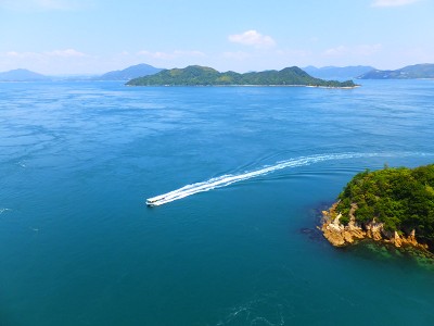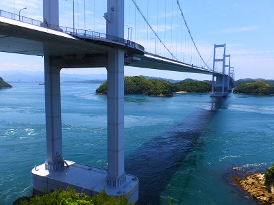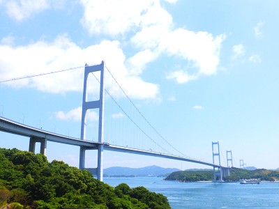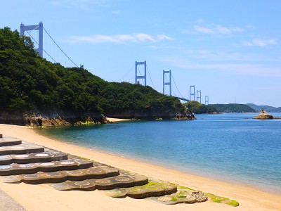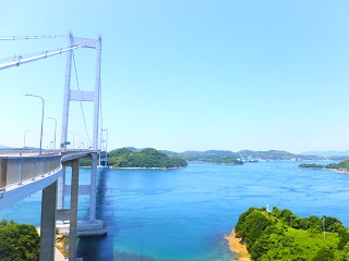 エメラルドをした新緑が萌える島々と、綺麗なセルリアンブルーの海のコントラストがとても綺麗!! 波も穏やかで海も澄んでいて、瀬戸内海は本当に、まるで箱庭のように美しかったです。 橋の上から覗いた海も、波打ち際がよく見える程に透明度が高かったです。