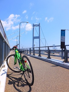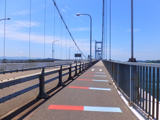 ちょうど、橋の真ん中地点に来ました。 馬島を挟んで、四国側…来島海峡第二大橋(1515m)、 本州側が来島海峡第一大橋(960m)と、 しまなみ海道をつなぐ橋の中では最も長い橋です。 あちこち写真撮影しながら進んだので時間はかかりましたが、 サイクリングターミナルと来島を結ぶ道を往復するのには やはり1〜2時間ぐらいかかります。