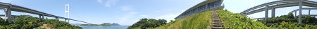 サイクリングロードをぐるぐるっと降りて、帰ってきました。 むふー、満喫、満喫! サイクリングターミナルから橋と瀬戸内海を望んで。 パノラマ機能は撮るのが難しい……が、楽しい!
