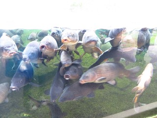 お、おう…… 恋の餌……違う、鯉の餌が売っておりまして。 餌付け慣れしているのか、人が通りかかると、ばしゃばしゃとガラスに群がる鯉たち。 迫力あります(笑汗)