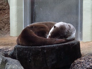 ここの水族館のアイドルのうちの1匹、カワウソさんです! 何カワウソだったっけな…… くるりんと丸まった姿がとてもキュート! お昼寝時間なのか、来館中は一度も目覚めてくれませんでした(笑)
