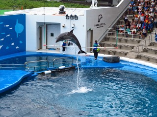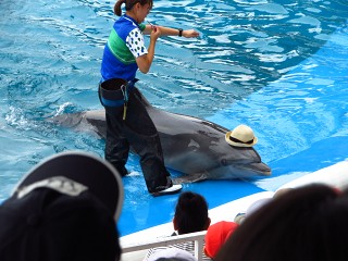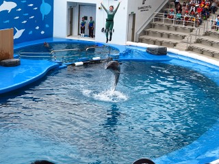 そして何より興味深かったのは。 トレーナーがイルカと一緒に泳いでパフォーマンスするお姿。 マリンピアでは、ハンドサインに合わせて演技をするだけだったので 実際に泳いで潜って、イルカと一緒に高くジャーンプ!!する姿には ただただ圧倒されました!!すごーい!!