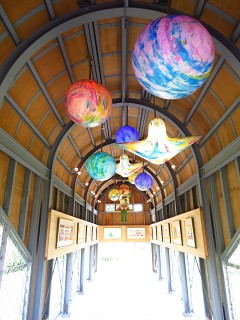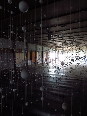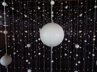 中へ入ると、そこはまさに不思議空間!! 天井から吊り下げられた糸に、いくつもの白い球体が規則的につながってぶらさがっています。