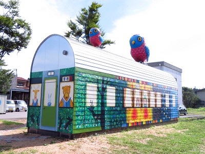 土市駅の方は、カラフルな倉庫の中で、男の子と犬の旅の様子を描いた映像が視聴できます。 音楽も牧歌的で、どこか懐かしくもきゅんと来るメロディーで、癒されます。 丁度倉庫の中がまた客車みたいな感じがして、電車で旅をしているような気分になります♪