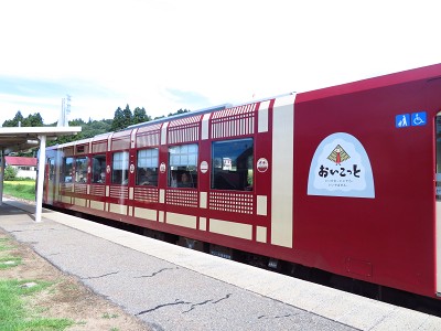 ホントに電車、来ちゃいました(笑) しかもなんと、和風なかわいらしいデザインの電車!! おいこっと ですって。 観光客と思われる方々が、数名乗っていらっしゃいました。 いいなぁ。どこへ旅に出かけるのかな。