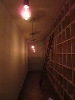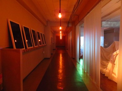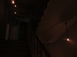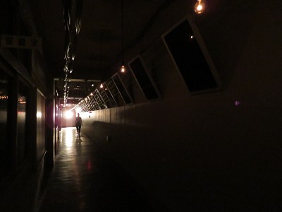 先程の不思議な空間だけで、ついつい足を止めてしまいそうになりますが、 次の道は、校舎の中へと続いています。 体育館から校舎側へと続く、僅かな電球が灯すだけの暗い通路を、先へと進みます。