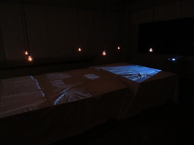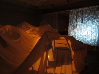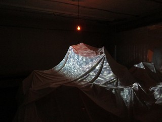 うず高く積み上げられた、何脚もの椅子と机。 それらには何故か、白いシーツが被せてあるのでした。 ちらちらとゆらめくあの青白い光が、走馬灯のように、ここでも垣間見られます。 重なり合った椅子の山は、もうひとつ。 こちらは、内側からオレンジの光に灯されています。